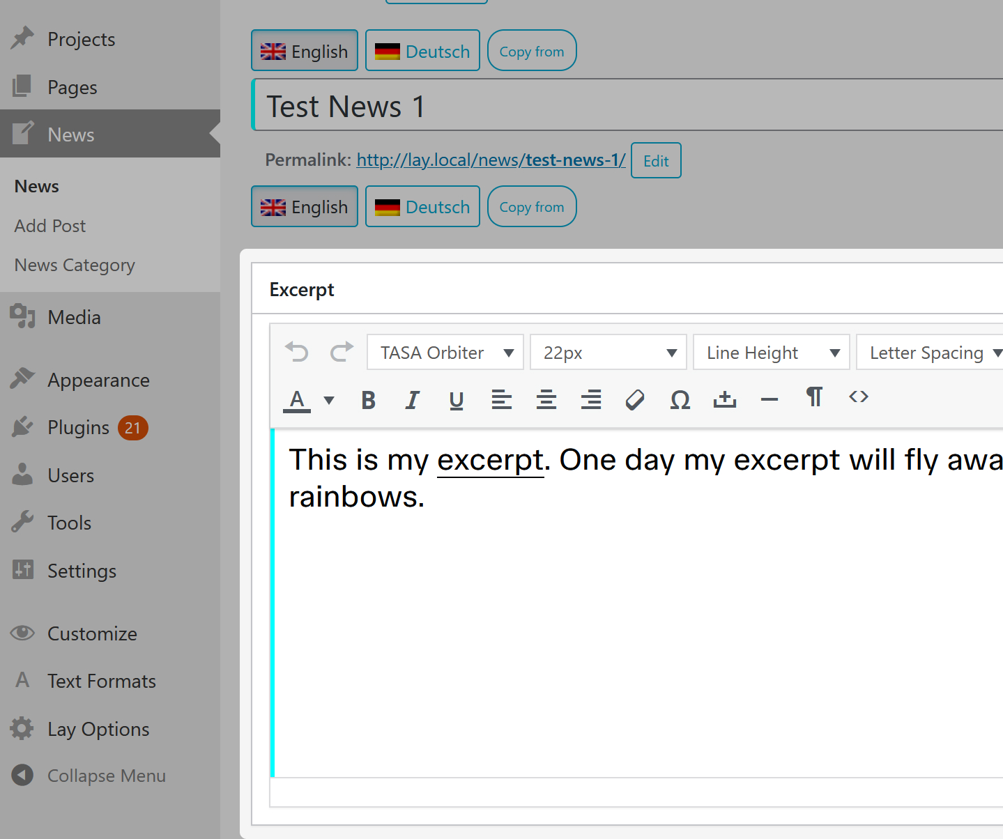 The "excerpt" will be shown as a preview text in your news overview.