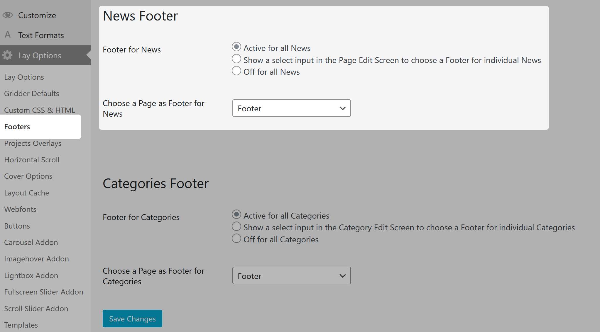 If you'd like your news posts to have a footer, you can set footer in "Lay Options" → "Footers" in case you have activated the footer feature in "Lay Options".