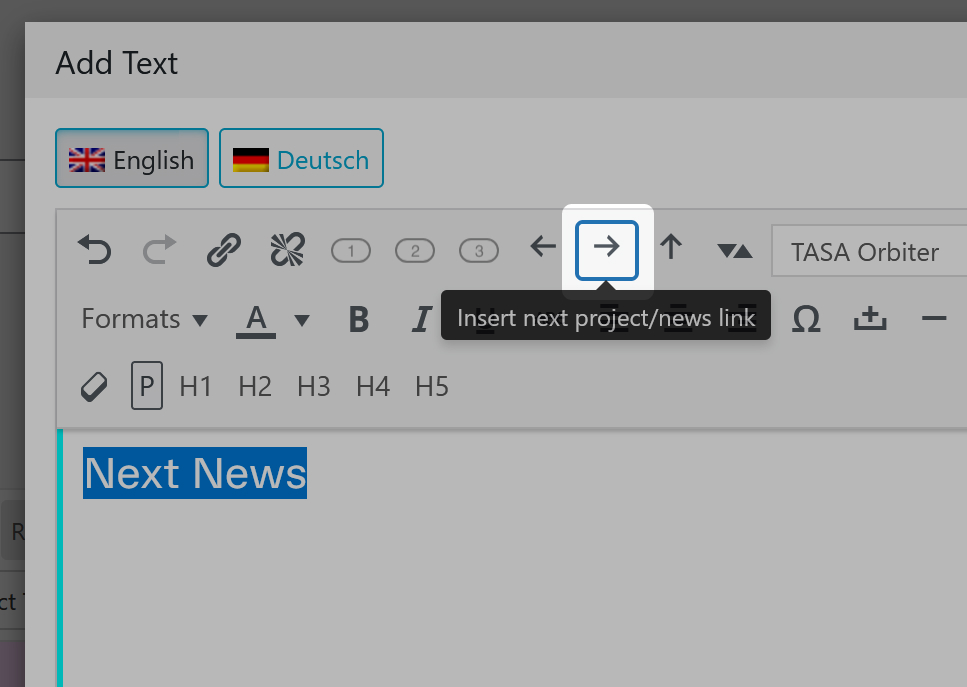 Any text inside this "Next News Link" can contain the text: $nextprojecttitle$. This will be replaced with the next news title.